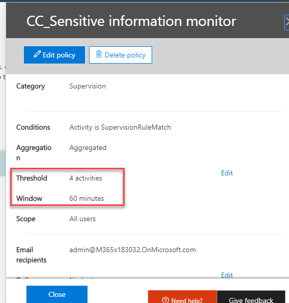 After creating the above policy, it creates alerts policy compatibly inside Alerts in office 365 security and compliance centre, and you can change the threshold, by default it considers 4 activities within 60 minutes.