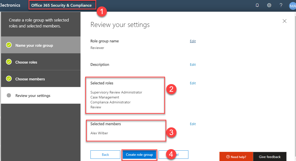Sign-in into Office 365 Security & Compliance https://protection.office.com/permissions with admin account → Go to Permissions → Create a policy → Add following role Supervisory Review Administrator, Case Management, Compliance Administrator, Review → Assign the members whom you want to include as reviewers → Click Create Role group.