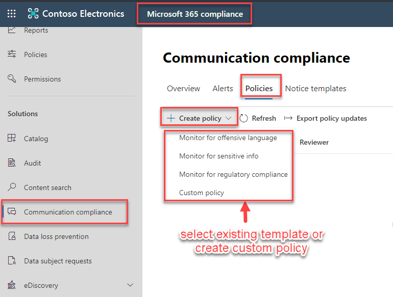 We can create communication compliance policy from https://compliance.microsoft.com → Communication compliance → policies → Create Policy → select the existing template/custom policy.