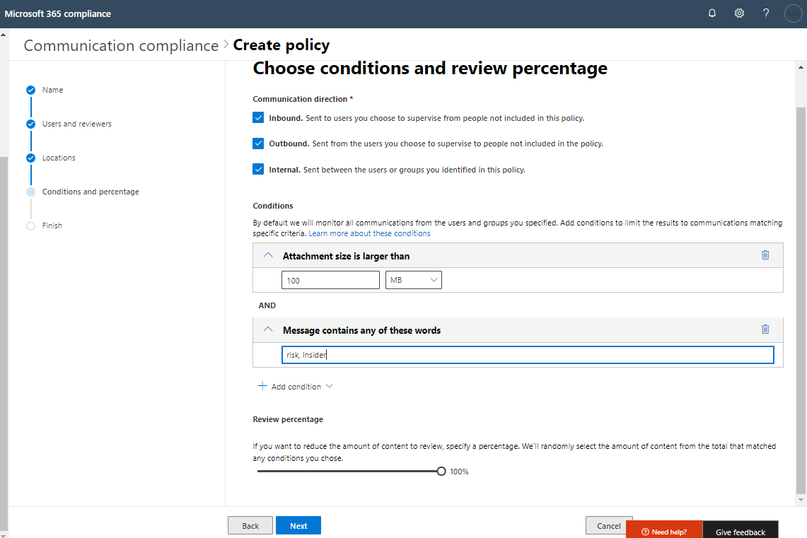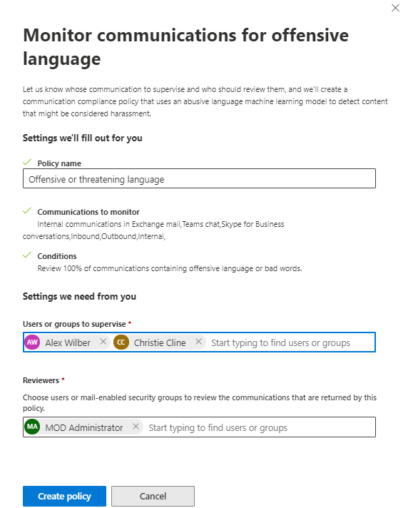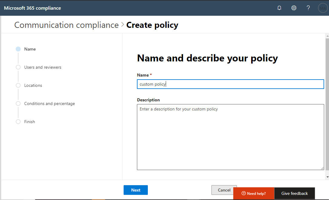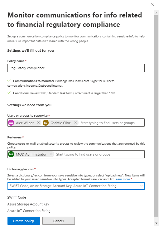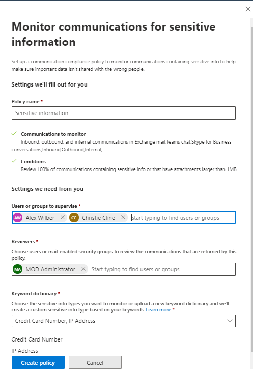 Using the custom policy, we can create the policy with our own rules to monitor specific communication channels, apply a specific condition, customize the amount of content review for supervision.
