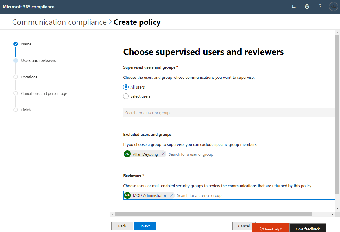 This setting allows us to choose the users or mail-enabled security groups to review the communications that are returned by this policy, by default it chooses the Admin account as a reviewer.
