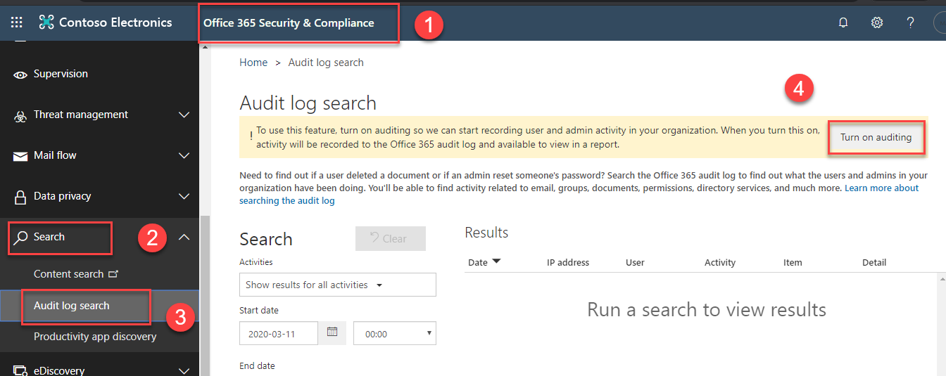 We need to turn on the audit log to show alerts and track remediation actions taken by the reviewer. To turn on the audit log, Go to Office 365 Security & Compliance center → Search → Audit Log search → Turn On auditing.