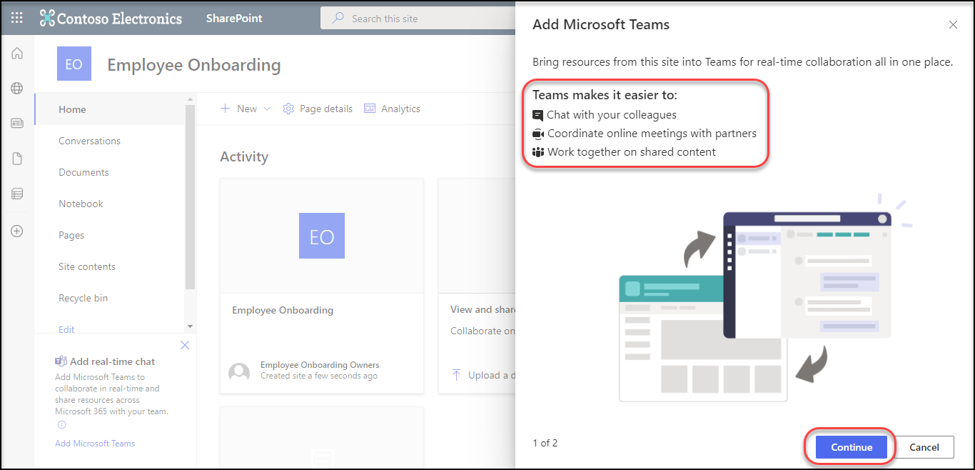 User is taken to a panel to walk-over the Microsoft Teams capabilities when linked to a Team Site. Click on ‘Continue’