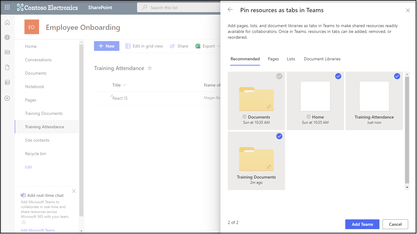 Add the SharePoint resources such as Pages, Lists, and Document Libraries as tabs in Teams to share the resources for easier collaboration.