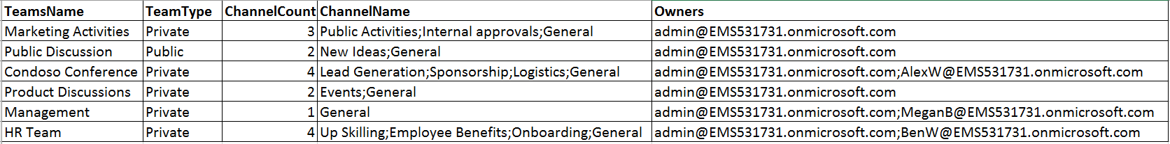 $Teams = "" | Select "TeamsName","TeamType","Channelcount","ChannelName","Owners"