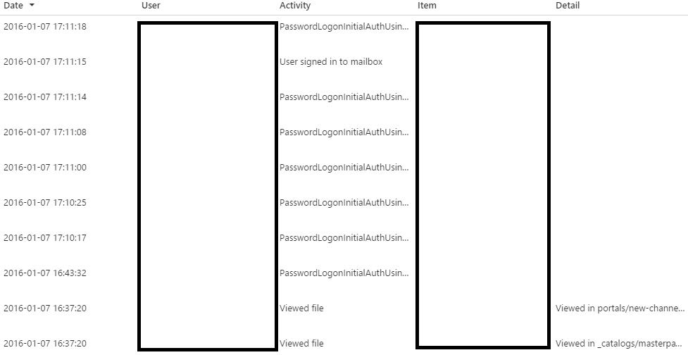 Search-UnifiedAuditLog -StartDate 1/6/2016 -EndDate 1/8/2016 -Operations PasswordLogonInitialAuthUsingPassword
