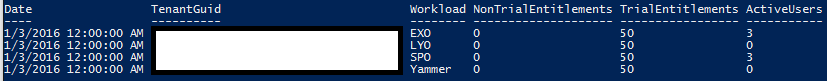 column “TrialEntitlements”. The column “ActiveUsers” shows the user