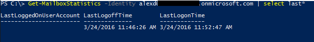 Search-MailboxAuditLog -StartDate ([system.DateTime]::Now.AddDays(-30)) -EndDate ([system.DateTime]::Now.AddDays(+2)) -Operations MailboxLogin,FolderBind -Identity alexd@xxxx.onmicrosoft.com -ShowDetails -First 1 | select Operation,LogonType,MailboxOwnerUPN,LogonUserDisplayName,LastAccessed