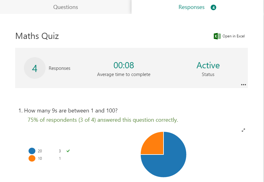 see the number of responses, percentage of correct answers for quiz