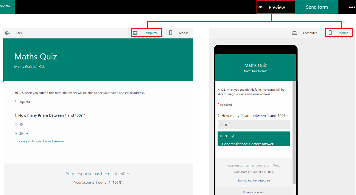 your quiz will look on a computer or mobile device. If you want to test