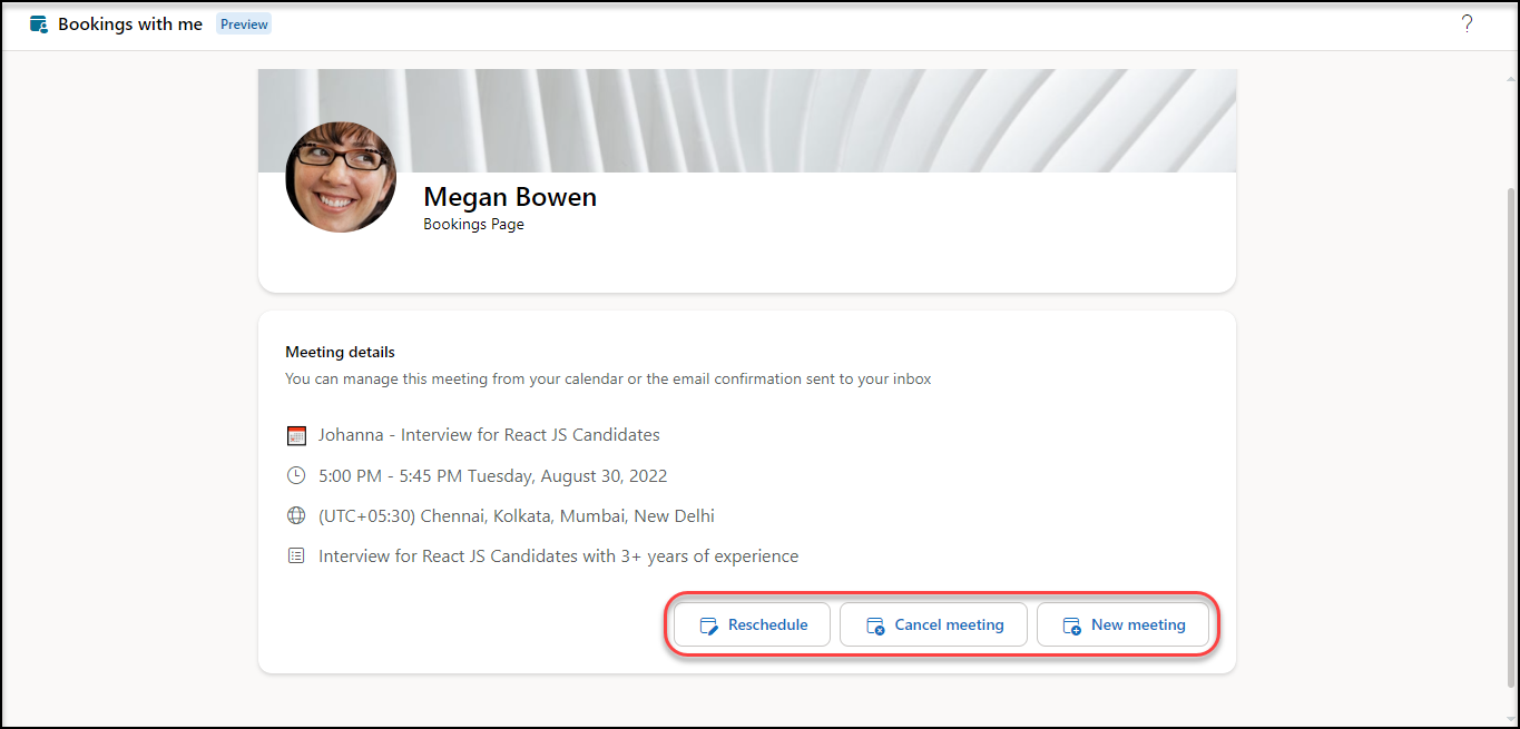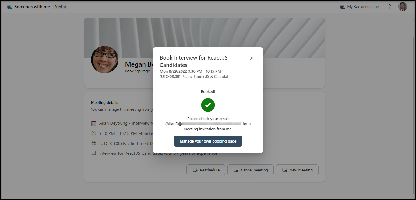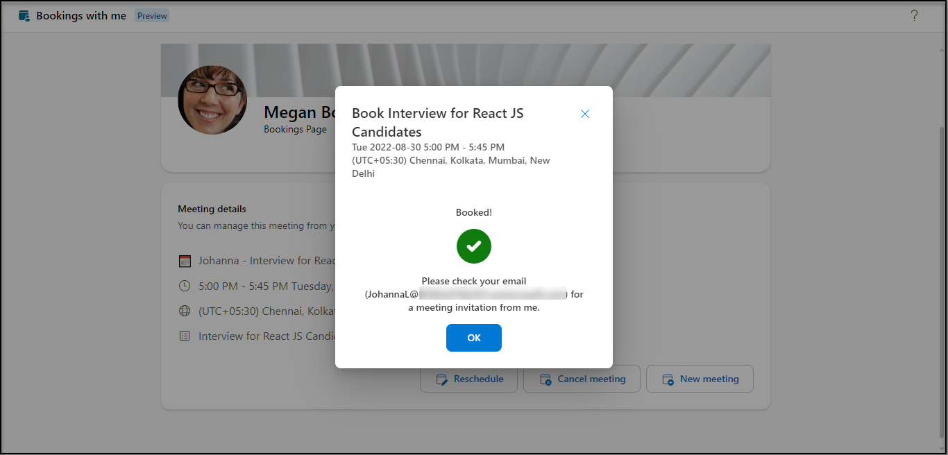 - On closing this window, the “Bookings with me” page is loaded with the meeting just scheduled. You even have the option to re-schedule / cancel / schedule a new meeting. A meeting invite is also sent to you & organizer.