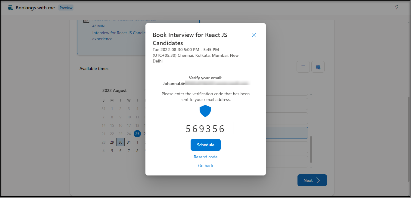 Step 3 : Enter the verification code sent to the entered email in the previous step and click ‘Schedule’.