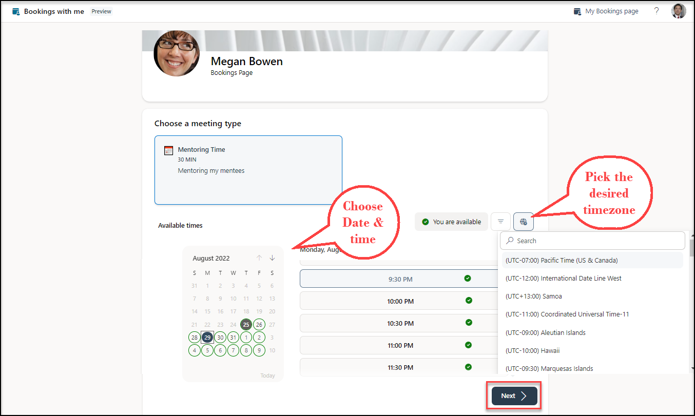 Step 1 : Choose a different time zone if required & choose the desired date & time. And then click ‘Next’.