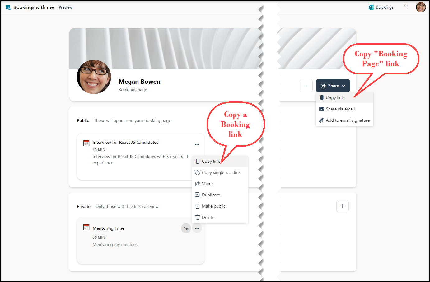 Step 2 : You can choose to share either the booking page link OR the booking link with others. You can share the booking link with the intended person & your job done.