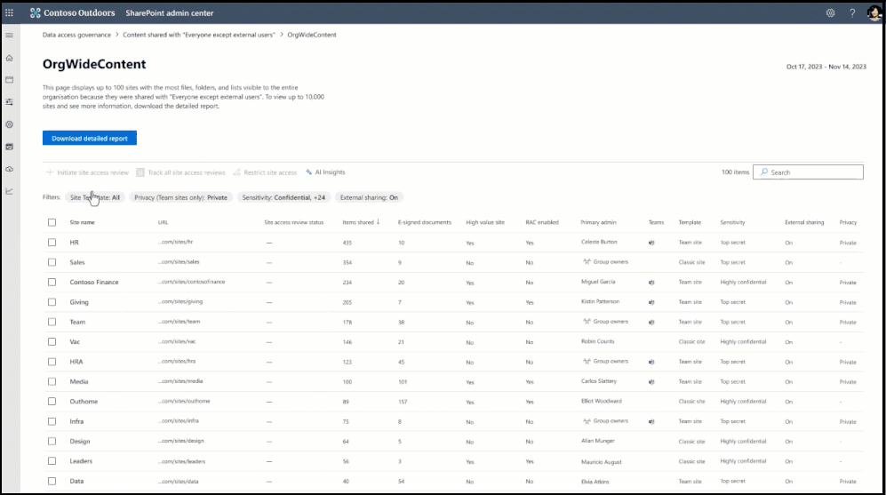 Data Access Governance (DAG) insights offer help by providing a top-level view of potentially overshared sites – filtered by sharing policy, Teams-connected sites, sensitivity labels, privacy, and more.