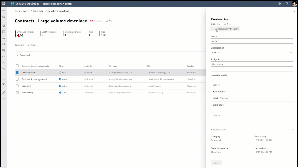On the other hand, Content Event Insights allow you to find “interesting” moments in the content lifecycle, such as high-volume sharing or large download volumes. Content Event Insights also provide important context, such as impacted users and specific files involved.