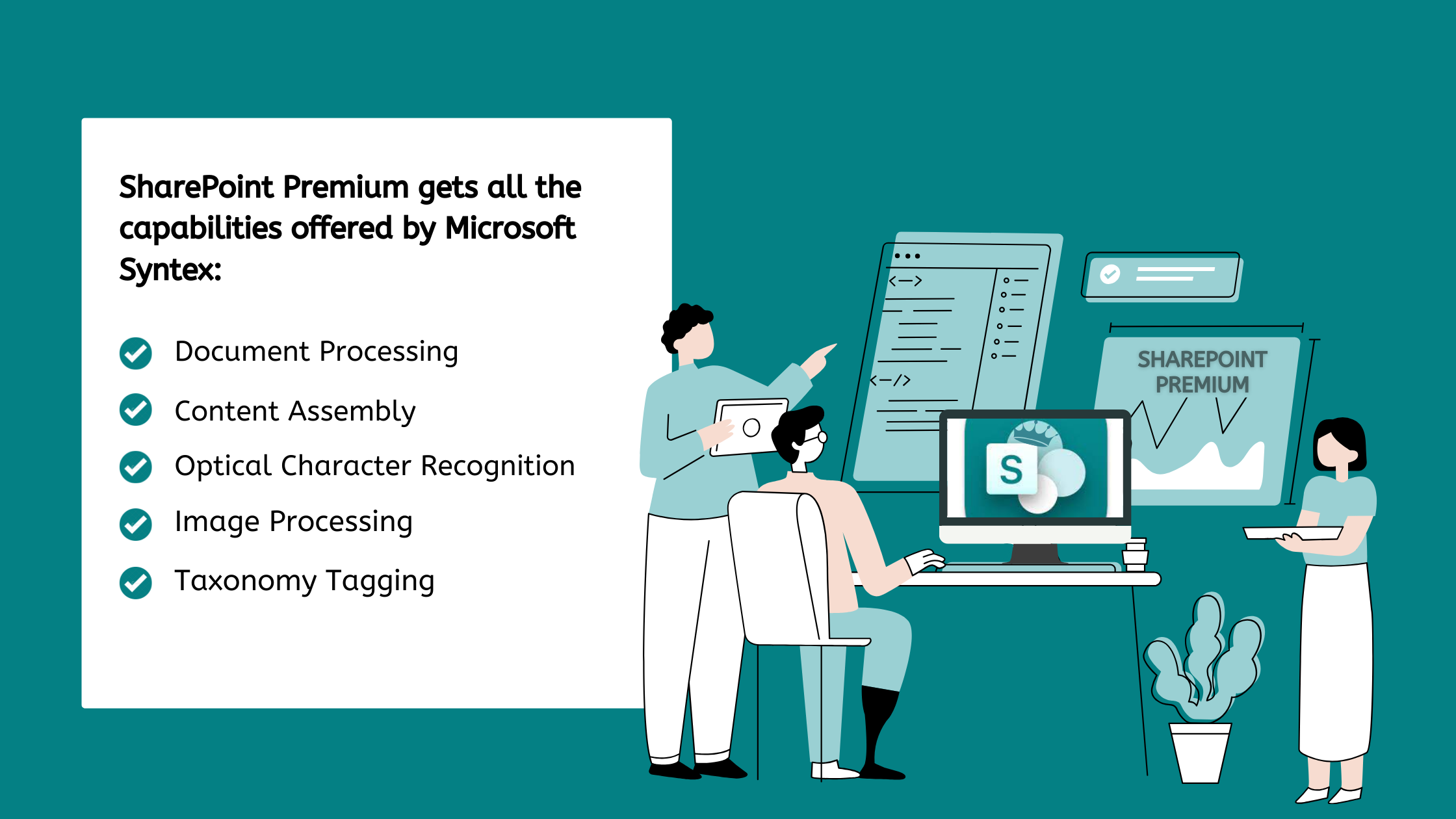 - As mentioned earlier in this document, services such as document processing, content assembly, optical character recognition, image processing and taxonomy tagging have all reached general availability under the Syntex brand, and going forward will be part of SharePoint Premium.