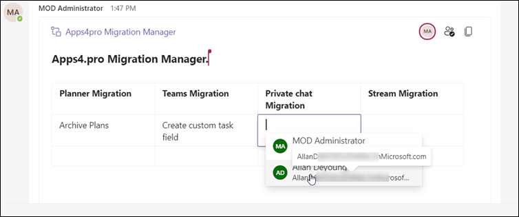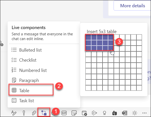 Select the component to be appended in the Team chat – for instance the Table component is chosen in the below example: