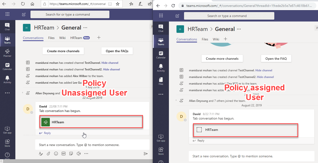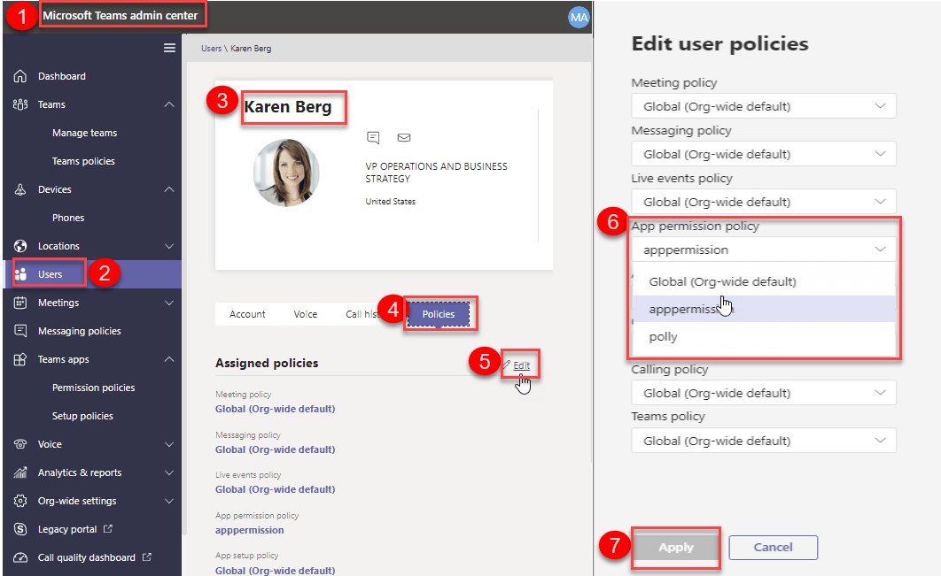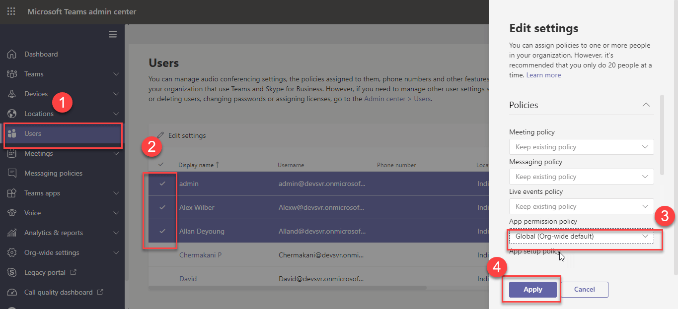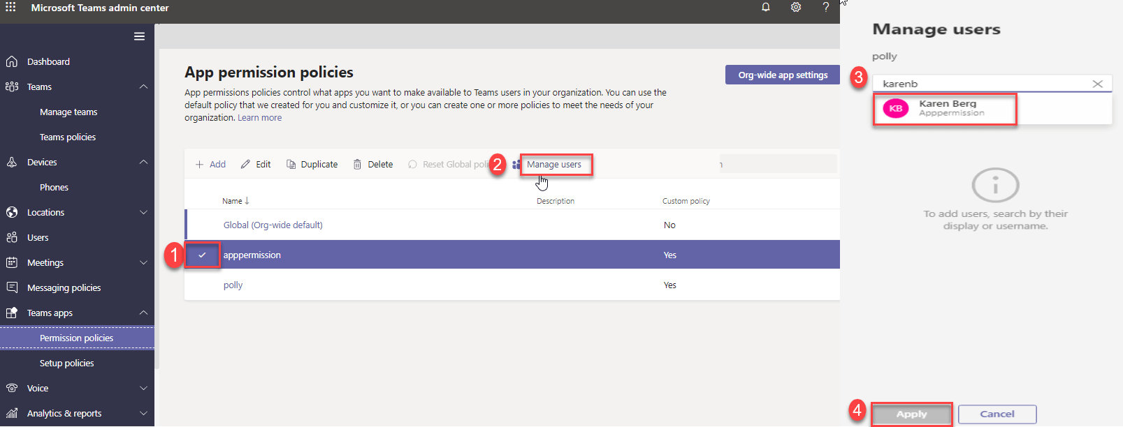 policy itself using Manage Users option. Go to Teams apps Permission