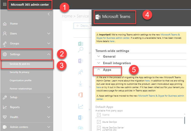 center Services and add-ins Microsoft Teams Apps.