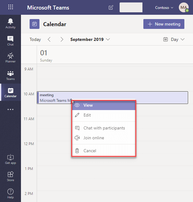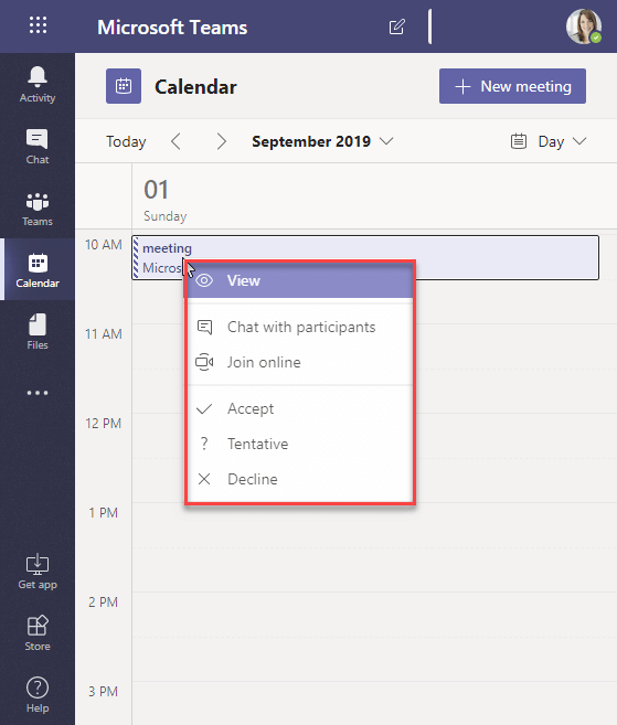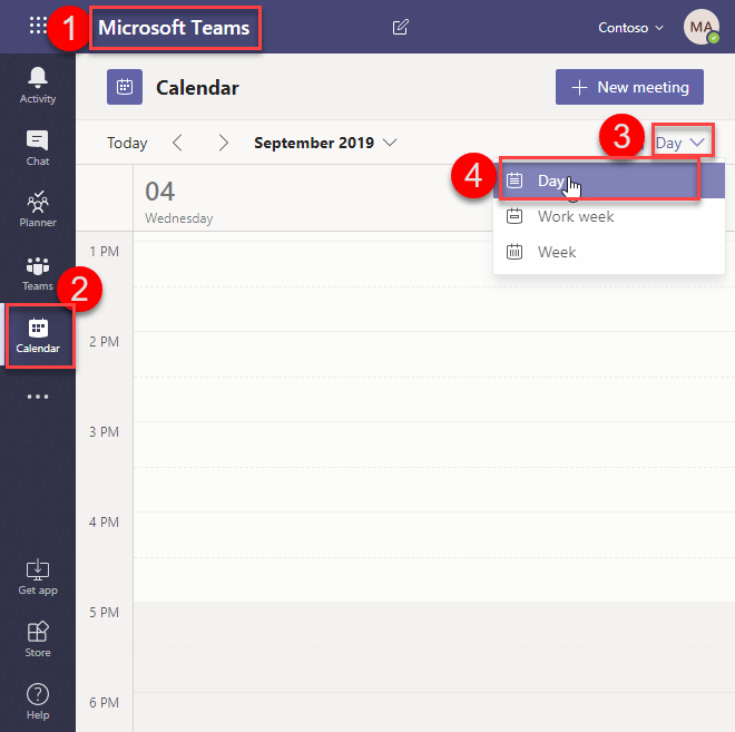 app and choose Day view from Microsoft Teams Calendar menu Day.