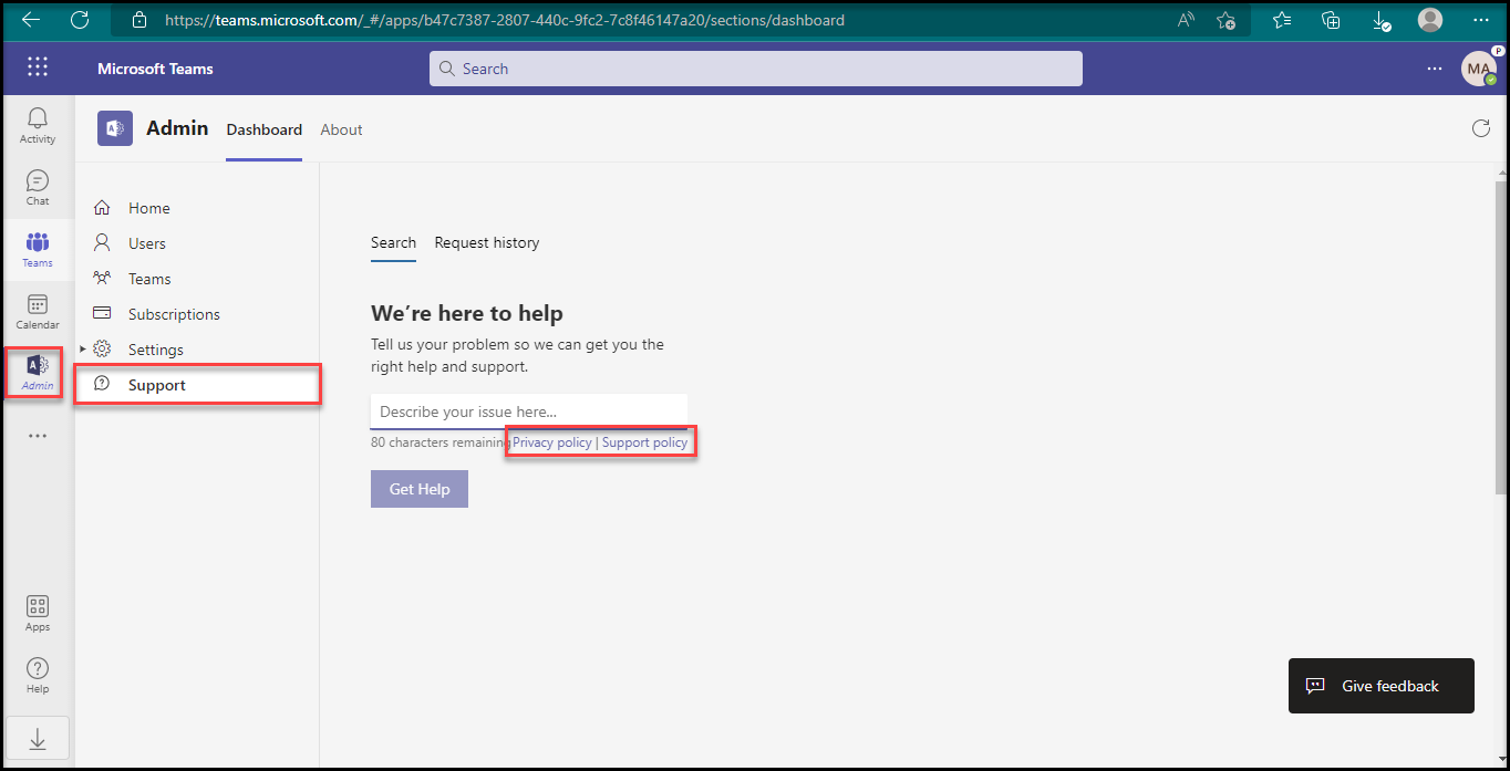 With the feature ‘Support’ from Microsoft 365 admin center – Users can raise the issues they face with the Microsoft apps & view the history of the service requests right from the Teams. Users can also view the Privacy policy & Support policy through the links provided.