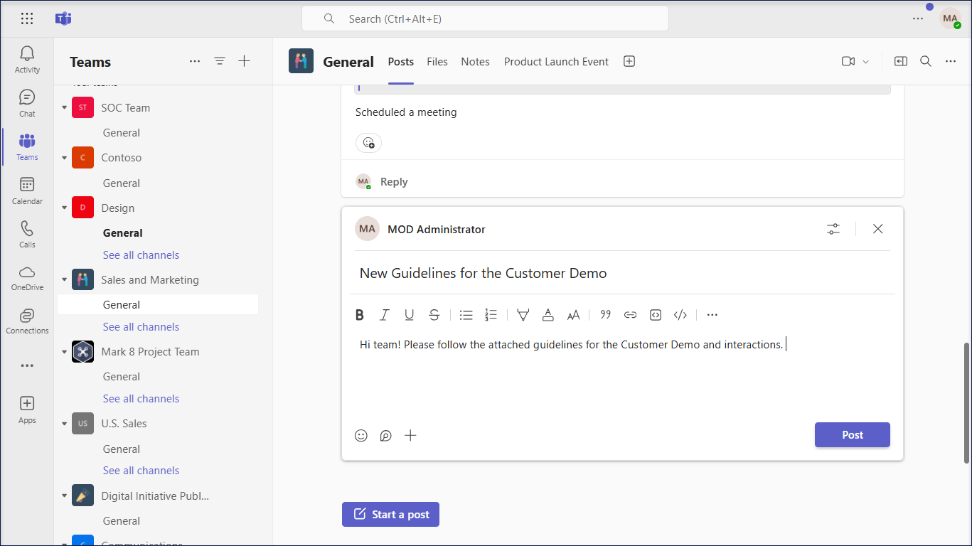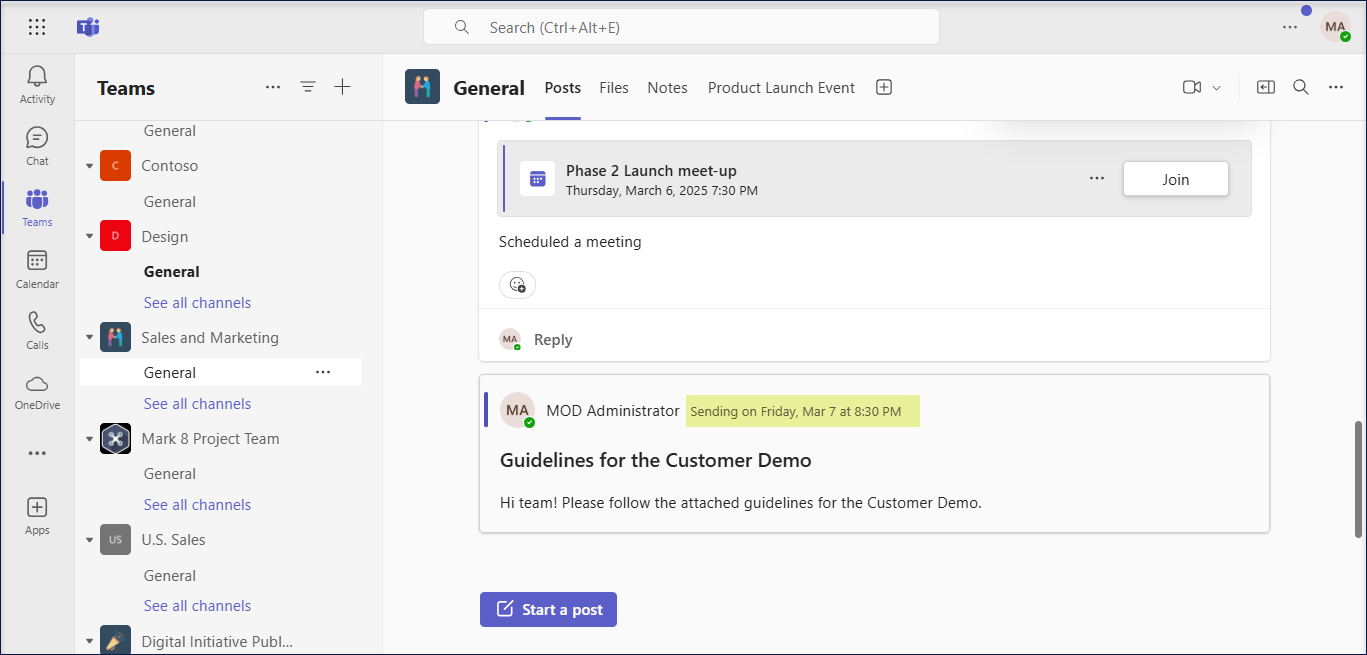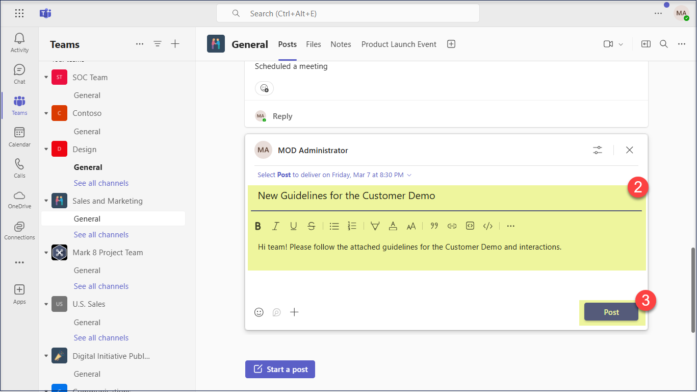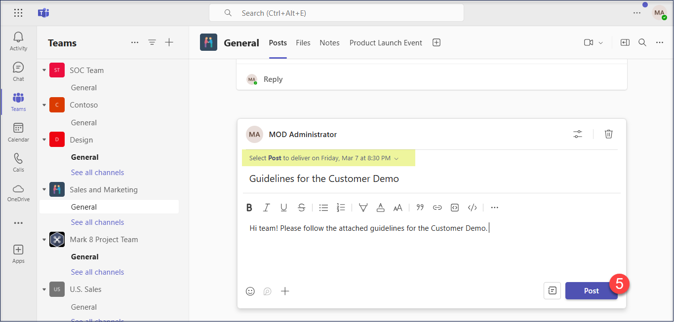 - The chosen date and time are displayed at the top of the message. Now, select Post to send the message per the scheduled date and time.