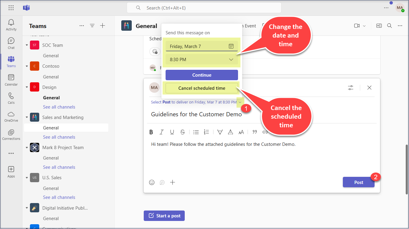 Reschedule the scheduled Teams channel message