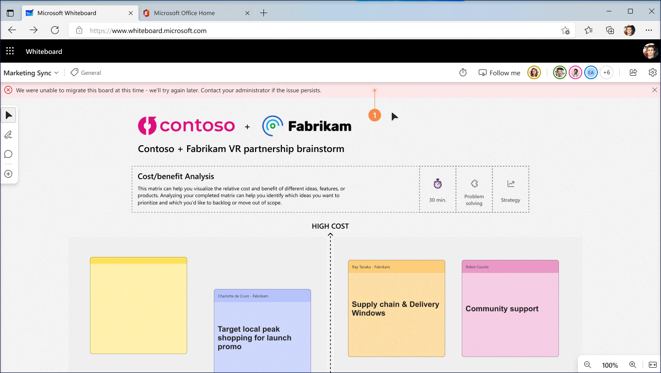 Users will be shown any error that prevents migration of the Azure Whiteboards as a message at the top of the Whiteboard app. The below screenshot shares an example of one such possible error.