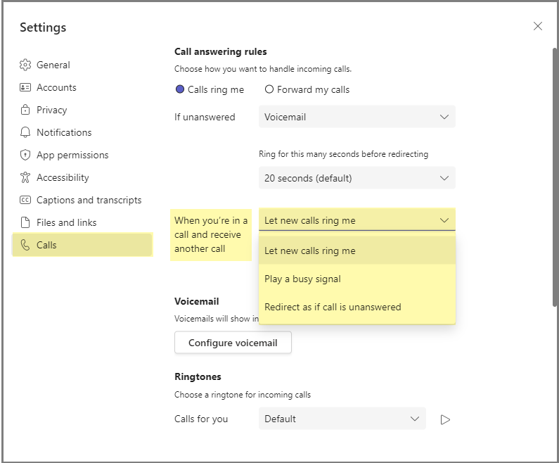 This new setting introduced, help you manage how incoming calls are routed when you are busy in an existing call or meeting directly. You can configure this from your Calls settings in the Teams app or on the web.