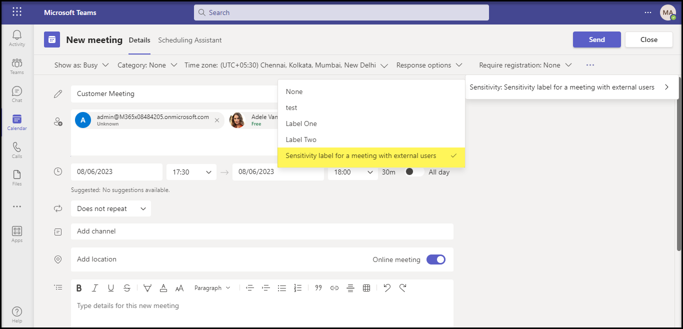 • Scheduling meetings with sensitivity labels is currently supported only on Teams Desktop