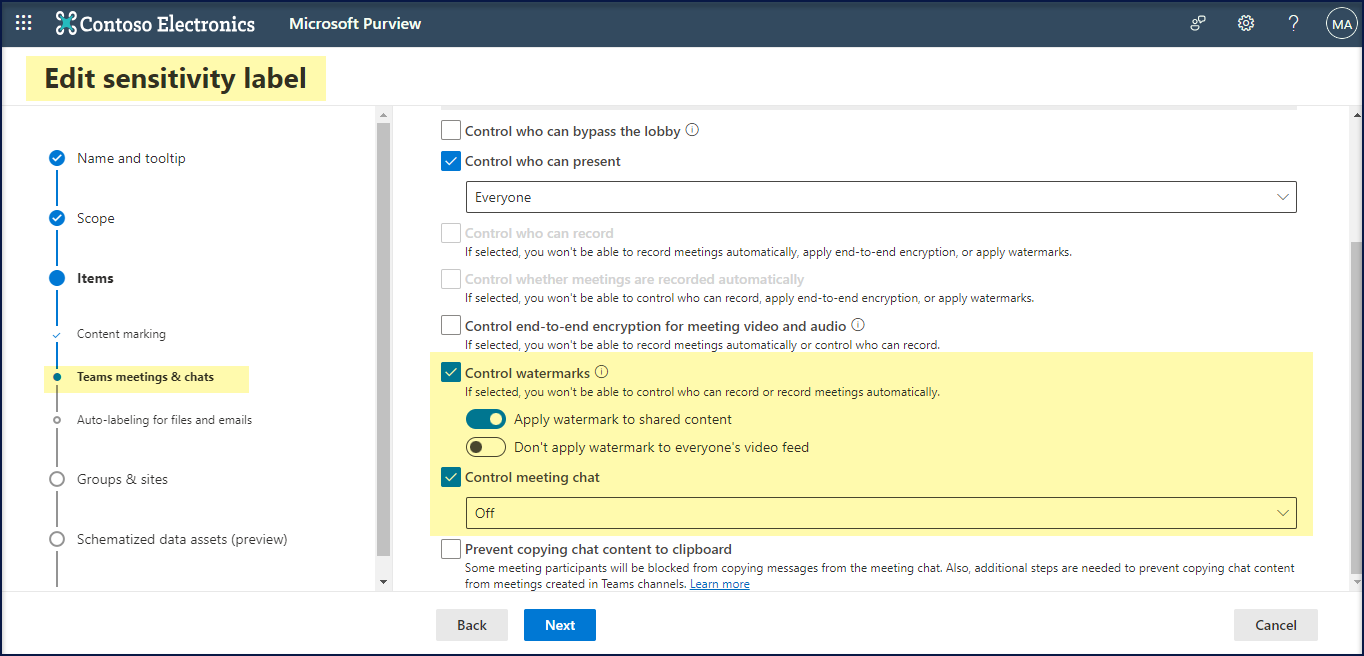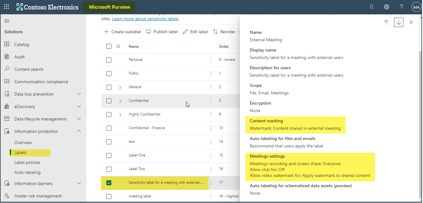 In this Label, we have restricted the meeting chat and applied watermark to shared content to see how it behaves during the meeting.