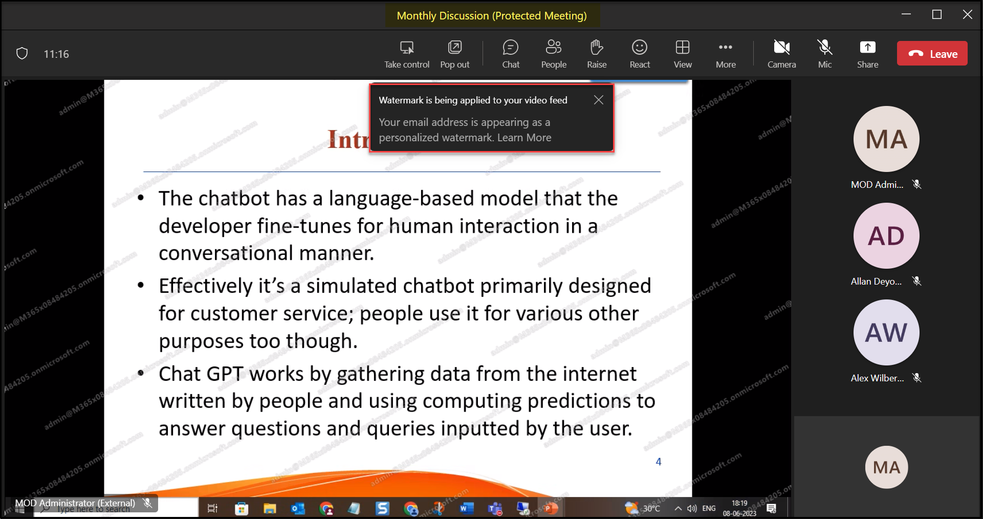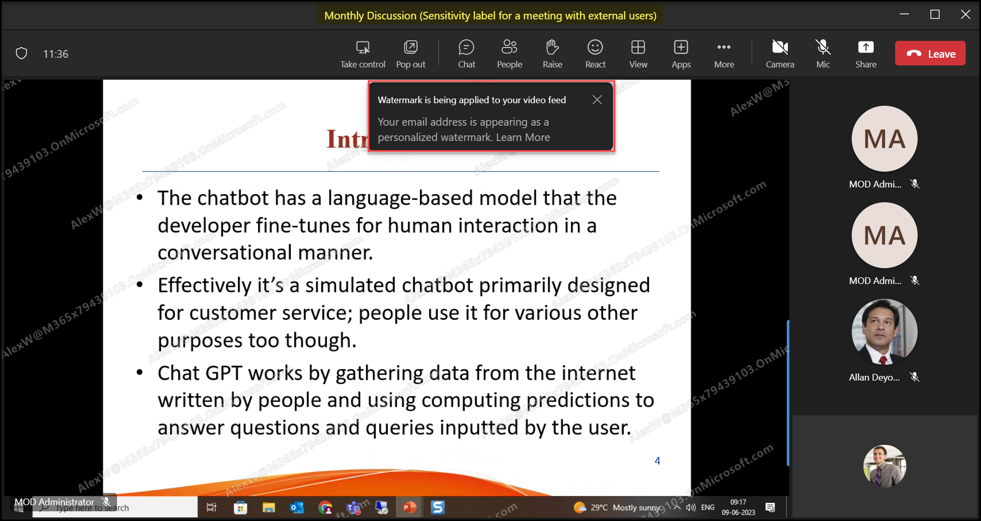 This is how the external users perceive watermarking in the video feed during the meeting. They find that the Meeting is protected.