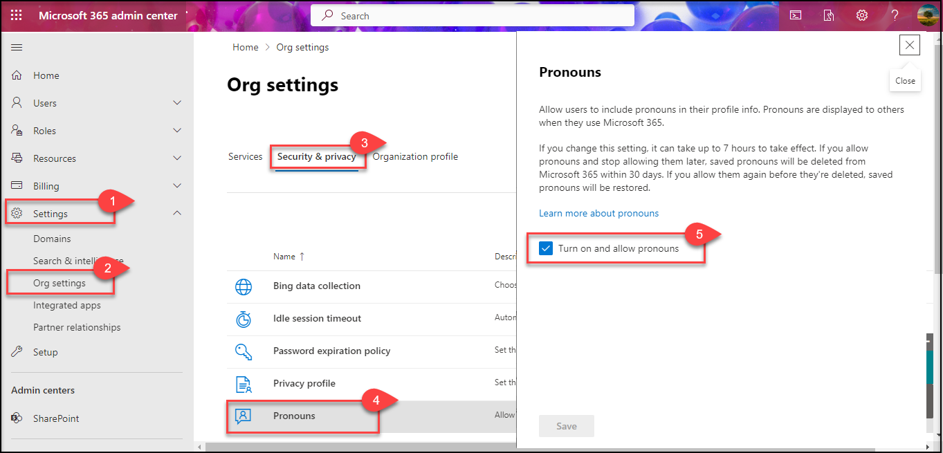 As a preparatory action, admins have to enable Pronouns at the organizational level. Please refer the below steps to enable the same.