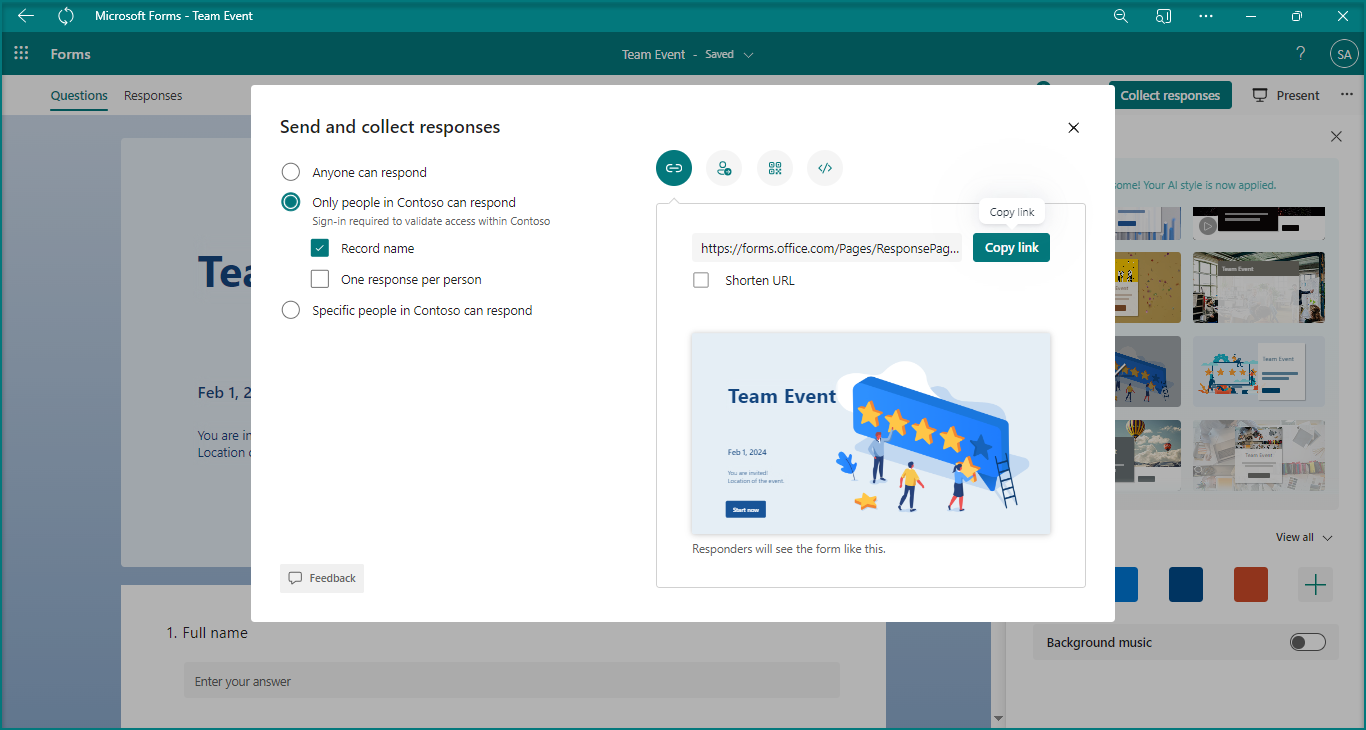 The User experience is quite the same with the Forms app as on the Forms website. You can create forms/quizzes, choose questions from AI suggestions and select from a variety of themes. Once you finish creating your form you can even effortlessly distribute it from the app.