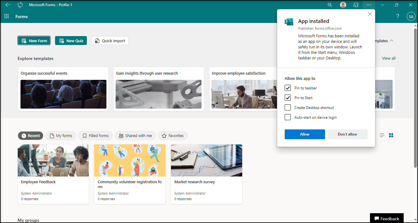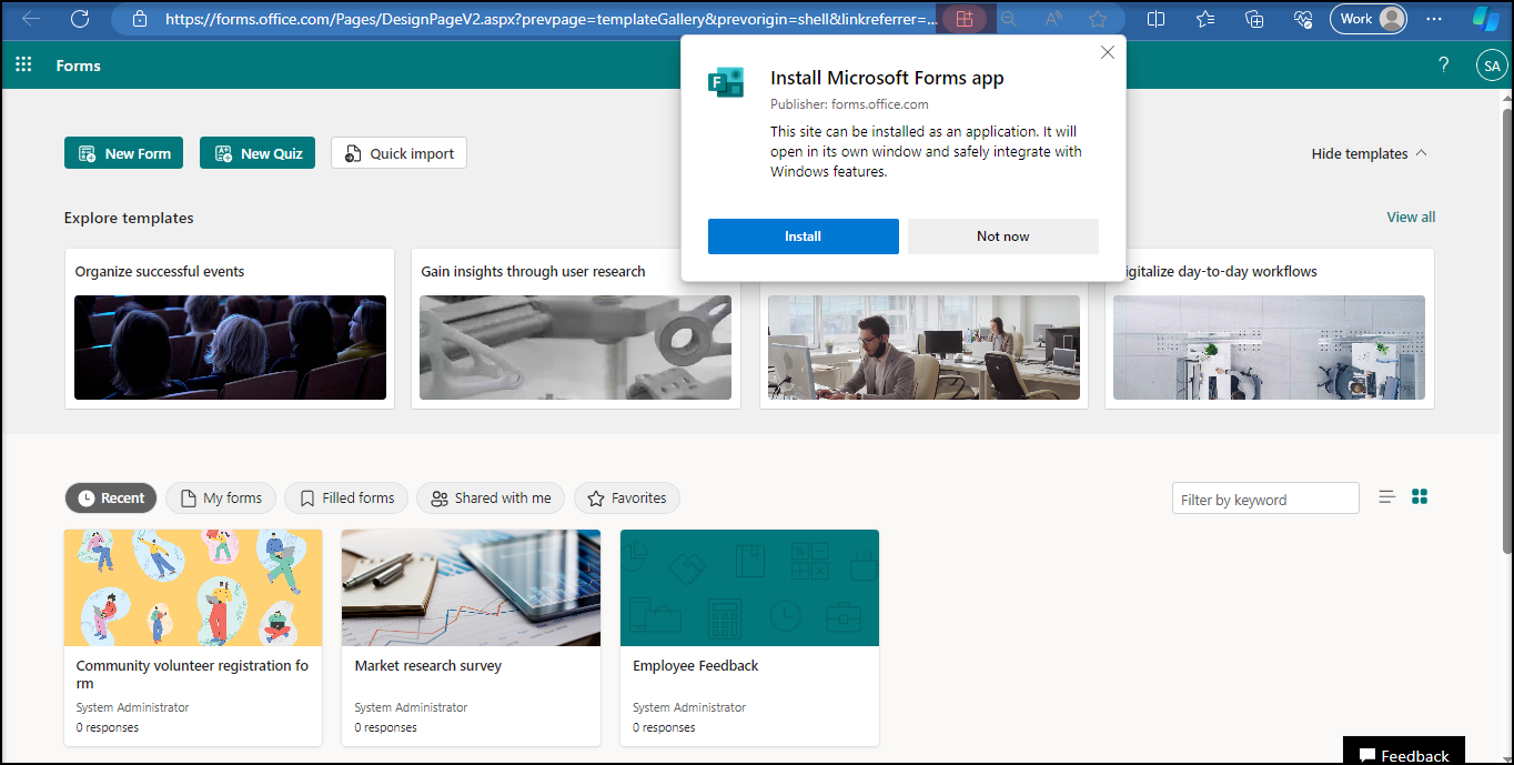 Method 2 : Get it installed from the Forms website. Click the small icon found in the address bar indicating the availability of the Forms independent app.