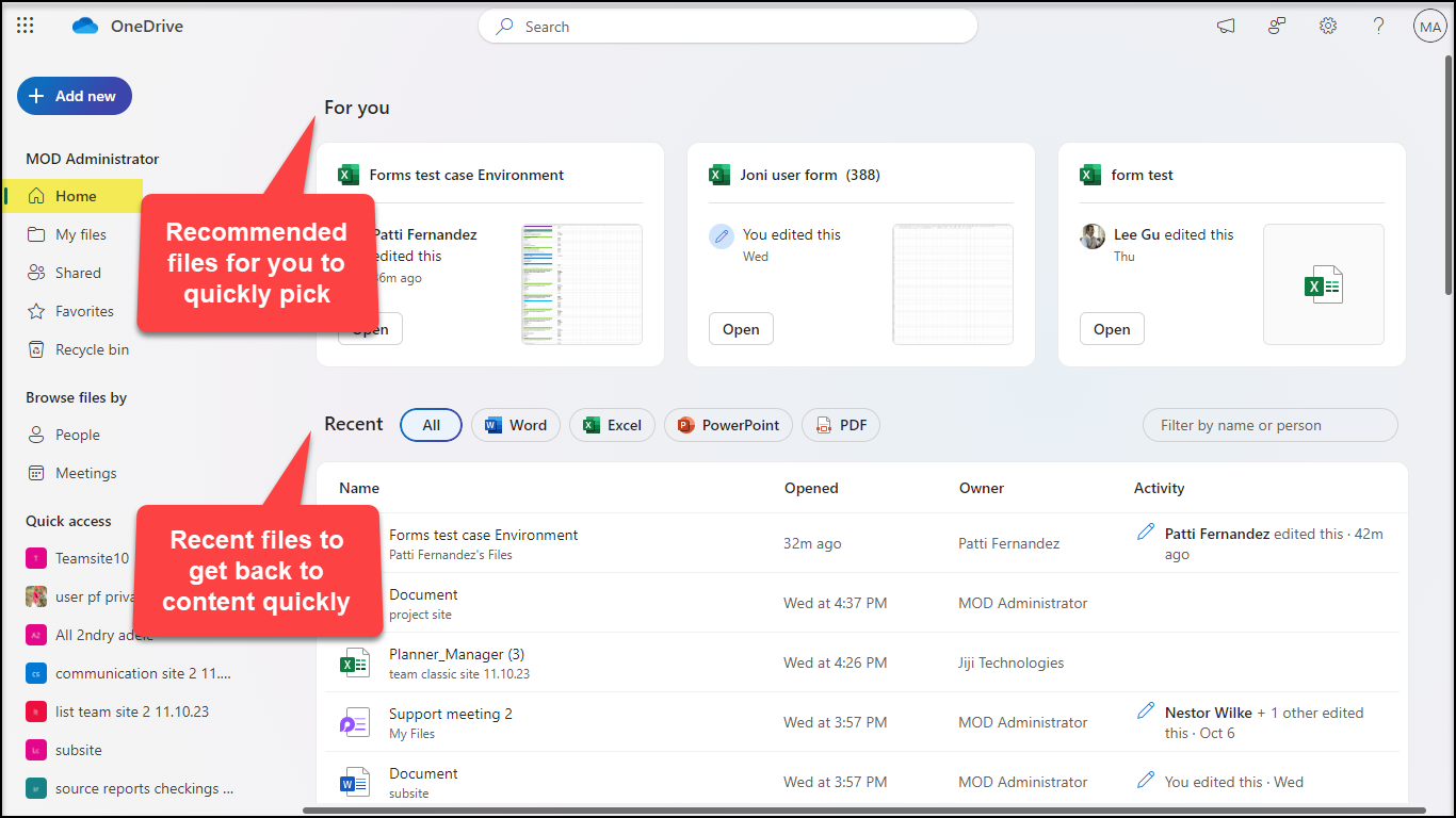 | It also renders rich, context-based organization, such as views that show you recent, shared, favorite and files from people & meetings. | |