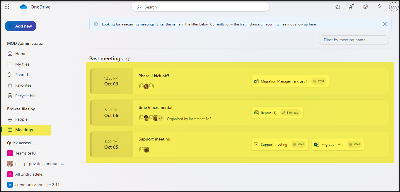 These Meeting experiences are expected to roll later this year. For now, files shared part of the Past Meetings are listed.