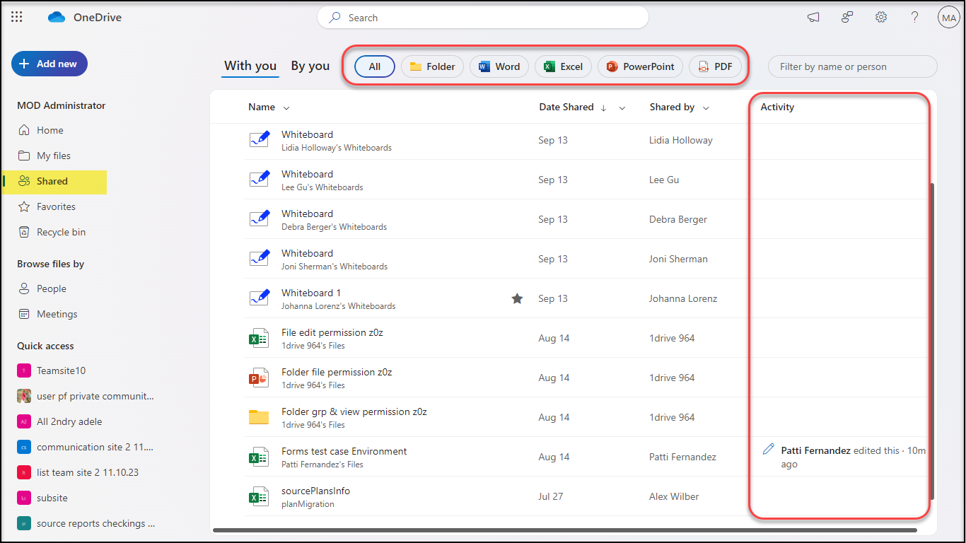 | You can witness both the files Shared by You and Shared With You here. You can also filter based on the file types – Folder , Word, Excel, PowerPoint, PDF. | ![]() |