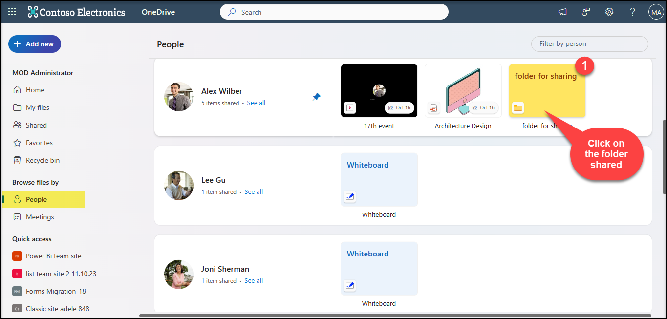 It is sometimes easier to remember the person who shared the file compared to the name of a file. Keeping this is mind, Microsoft introduces a view where your files are organized by the people you are working with. Not only Files, Folders shared by the people are also displayed here.