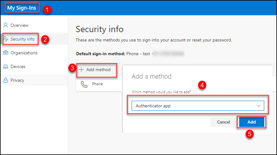 Security info → Add method → Select Authenticator app