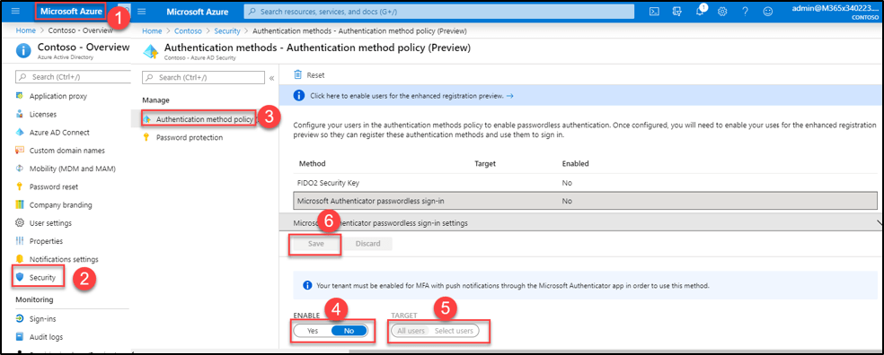 Authenticated method policy - Click Microsoft Authenticator Password-less sign-in → Select Enable