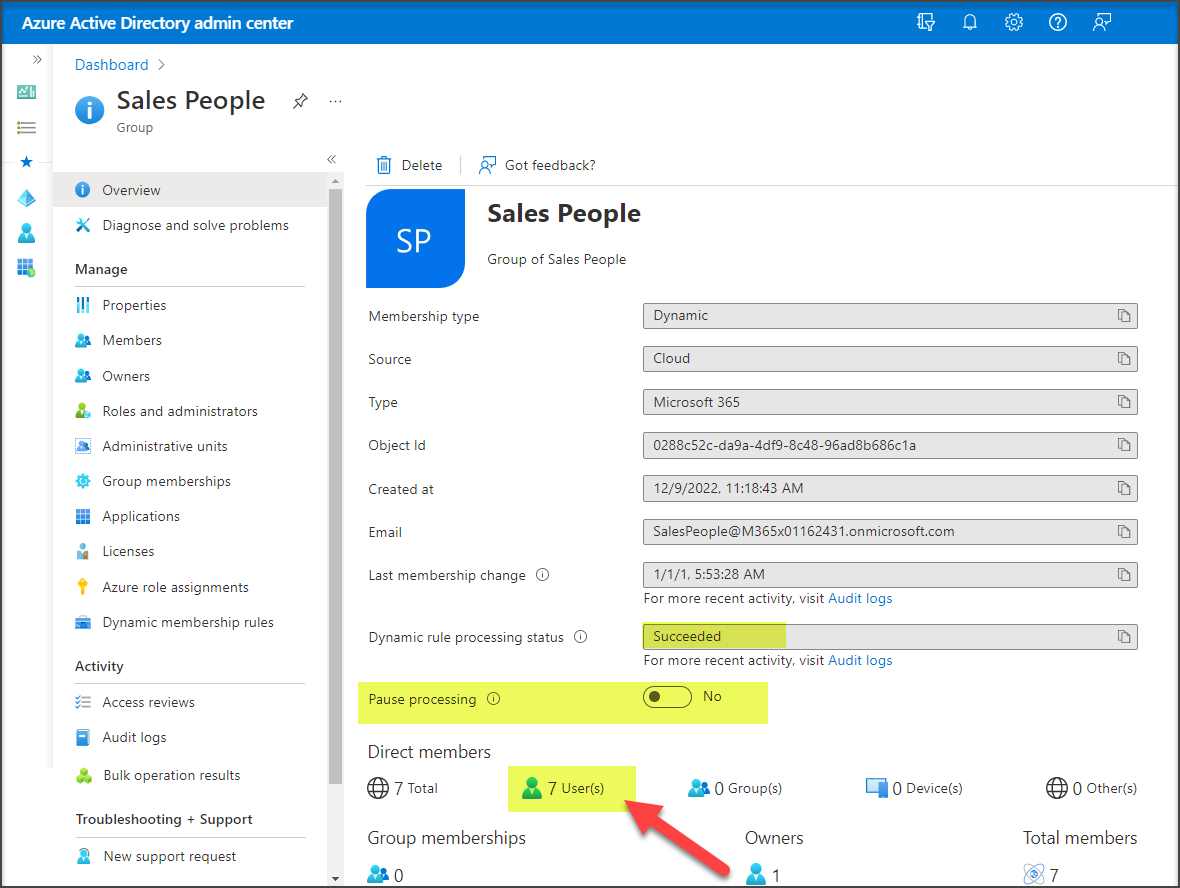 Turn-off ‘Pause processing’. Wait for ‘Dynamic rule processing status’ to change to ‘Succeeded’. You can witness that the new members moved to Sales department are reflected in the group membership.