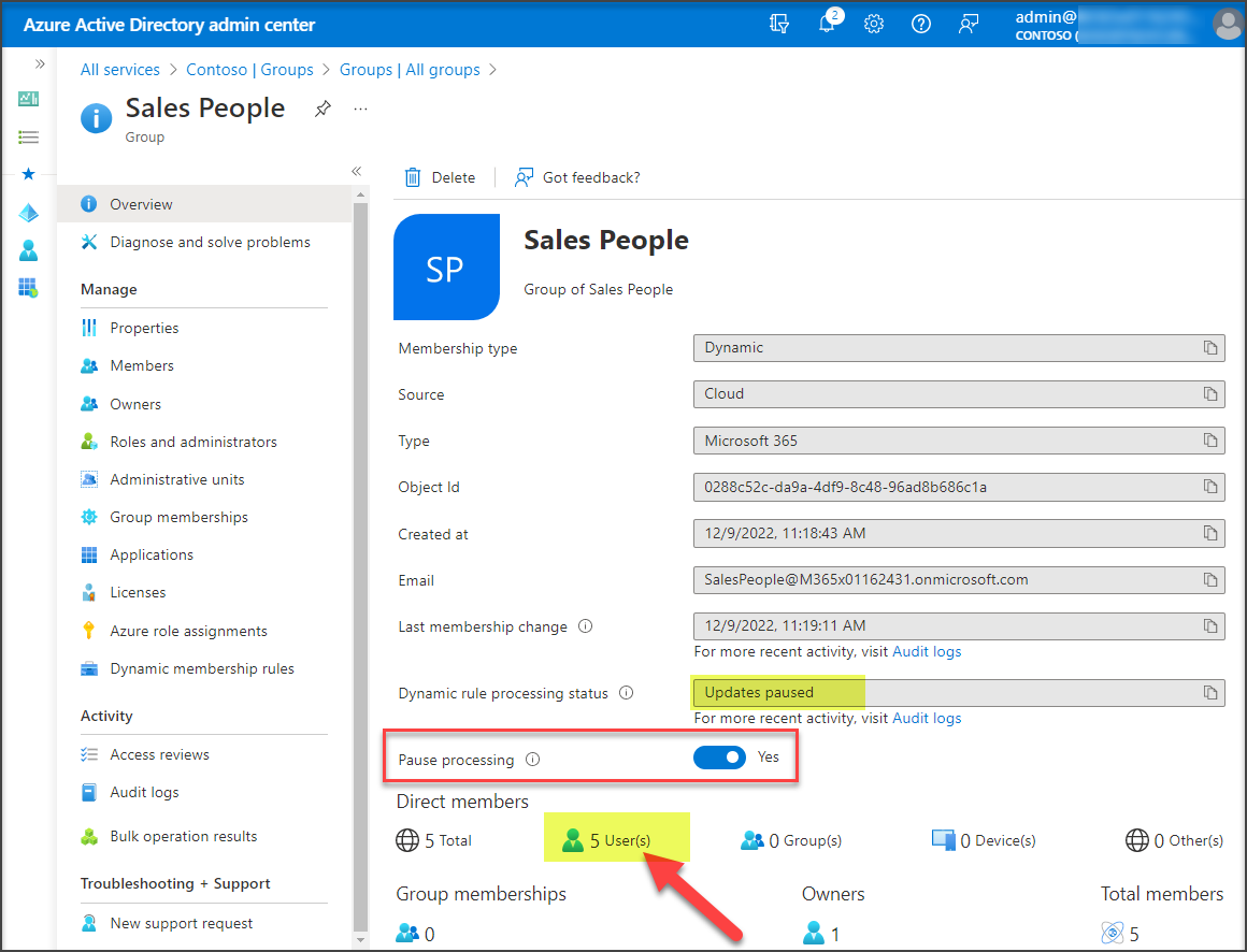 The Azure AD admin center now includes the option to pause processing of the membership query for an Azure AD dynamic group.