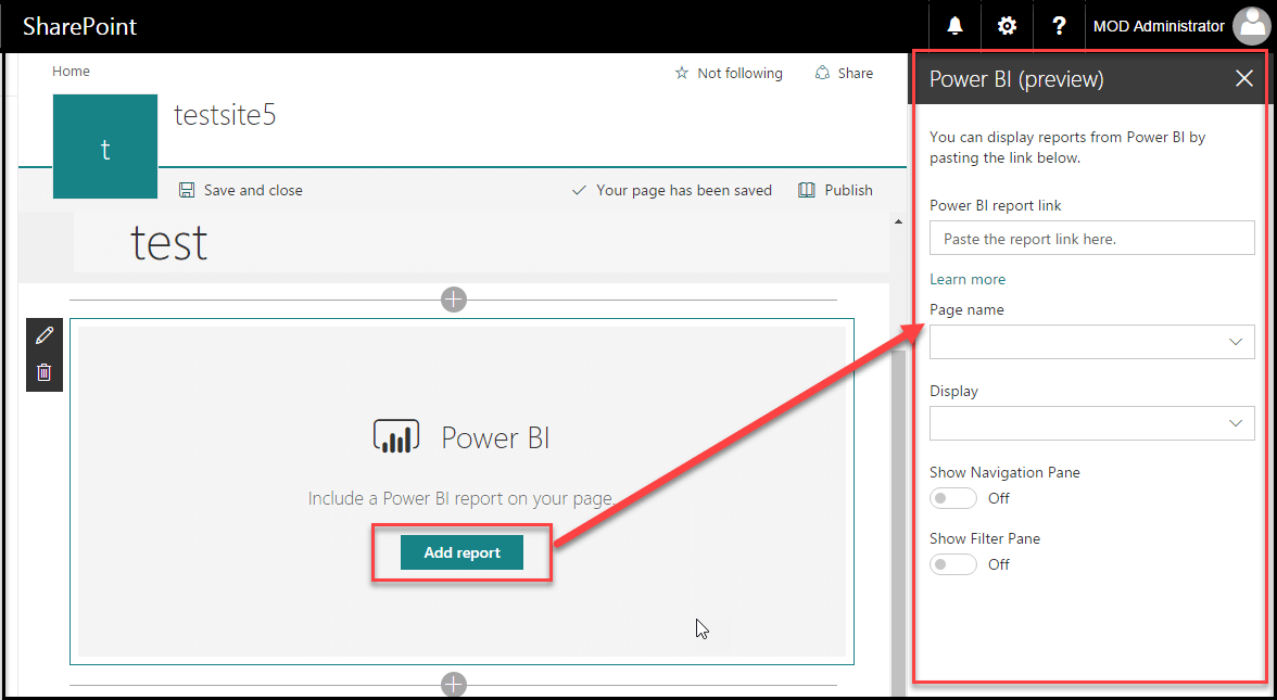 Microsoft added Power BI web part (preview) in SharePoint modern page.