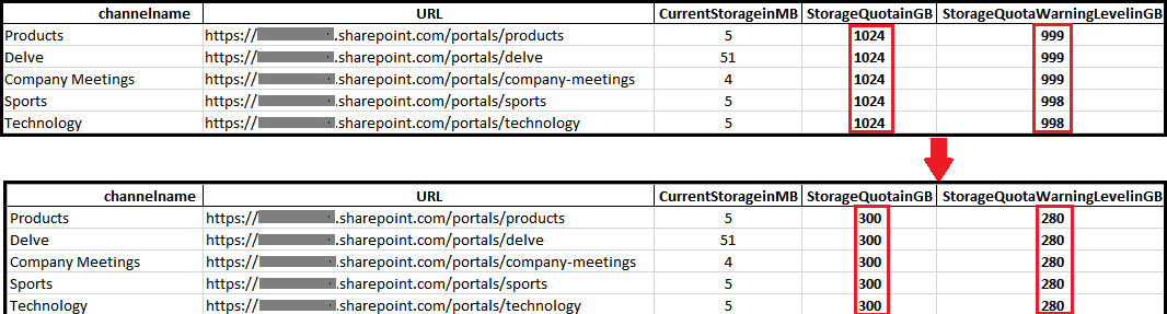 the Storage Quota for Office 365 Video Channels using modified CSV file.