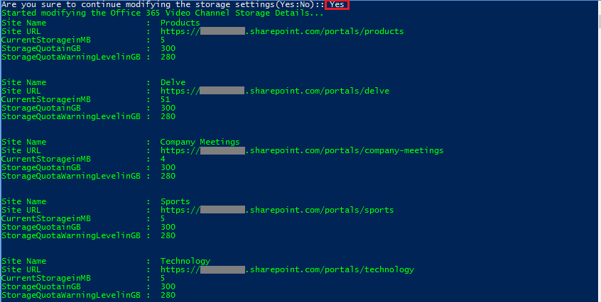 After executing the script, Office 365 Video Channel storage settings