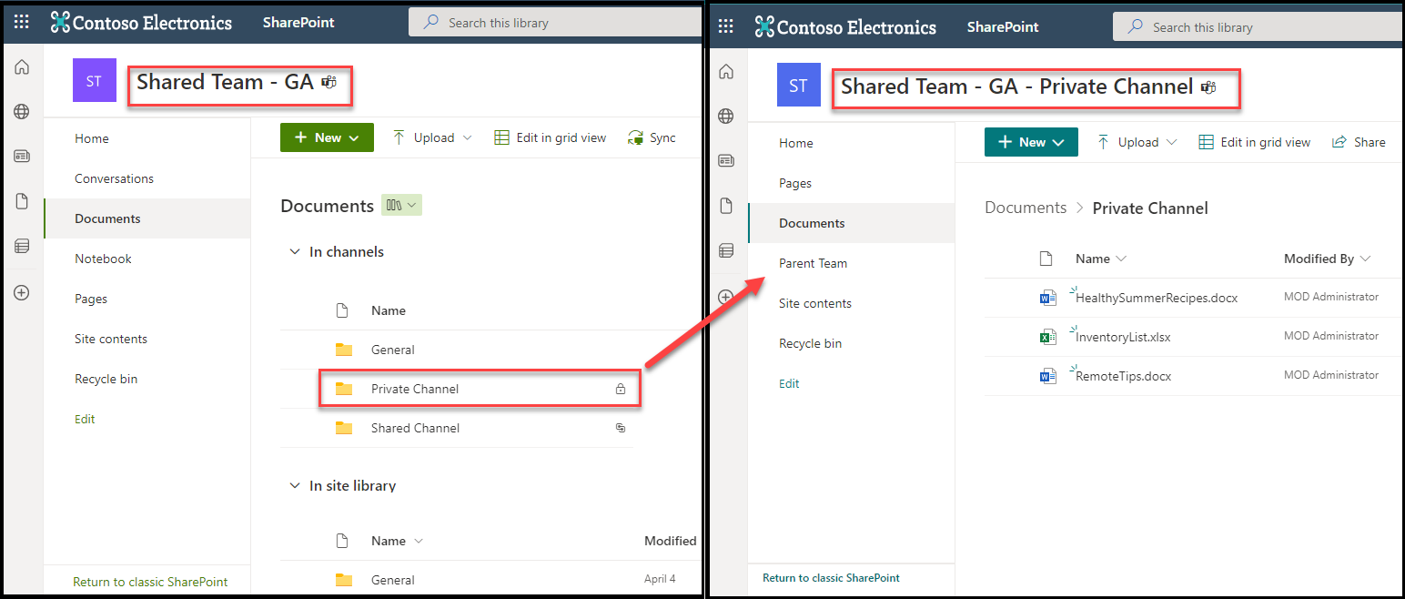 The concept of a separate site for a Private / Shared channel still holds good. Only a link to the site is provided under “In channels”. On clicking the link, the user is routed to the relevant channel site.