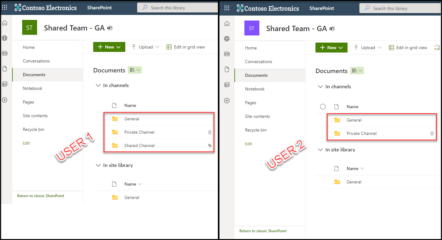 When a user navigates to the document library of a SharePoint site associated with a team, the “In channels” – a new section will be visible. It is currently collapsed by default. The “In channels” section will include all Standard, Private & Shared Channels within the Team.