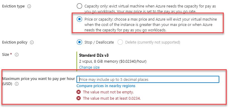 Restarting the evicted VM: Selecting the Max price greater than the current price.Restarting the evicted VM: Setting the Max price, that is lesser than the current price, it shows an error, that the max price needs to be greater than the current price